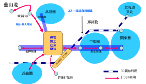 米原市の国際物流拠点開発計画作成 (行政から受託)米原市の物流立地に着目した、鉄道輸送、トラック輸送、国際海上輸送のモードが結節した複合物流センター。